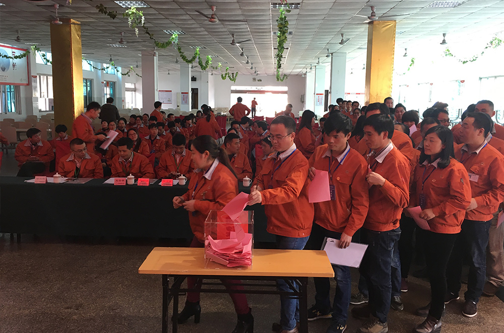 On November 30th, 2016, Shuanglin held the First Session of the 3rd Congress of Worker and Staff. The meeting was presided by Vice Chairman of the Labor Union Wu Haifei. Total 115 representatives of the workers and staff attended the meeting. Vice General Manager of Shuanglin and General Manager of Accessory Division Chen Youfu, Secretary of the Party Committee Lou Yongmeng, Chairman of the united labor unions and Director of Human Resources Wang Hongmei, and Directors of each plant also attended the meeting.